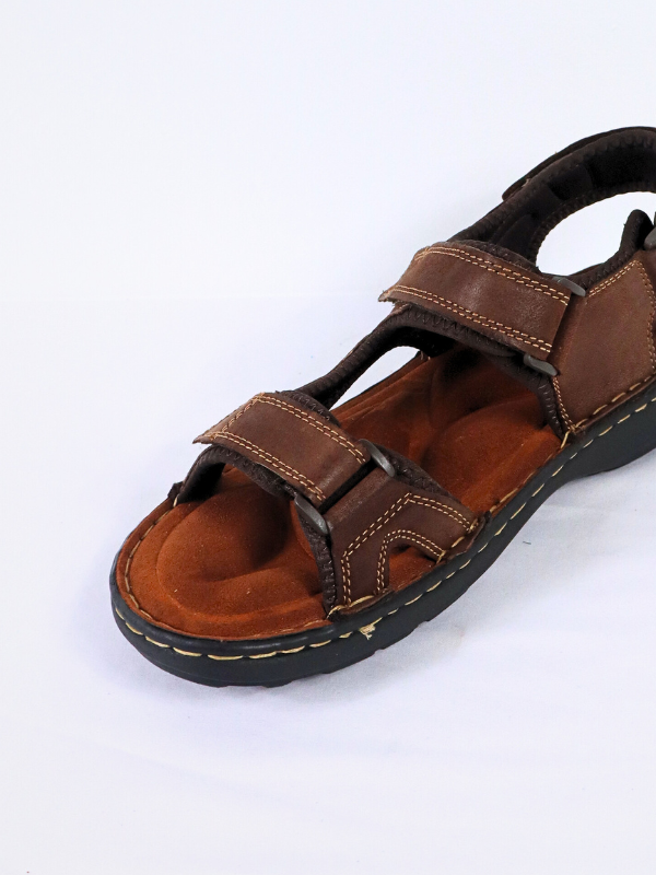 Sandalias de piel autentica para hombre, diseño de bandas, puntadas, puntera abierta, cierre de velcro, plantilla suave, suela de caucho resistente.