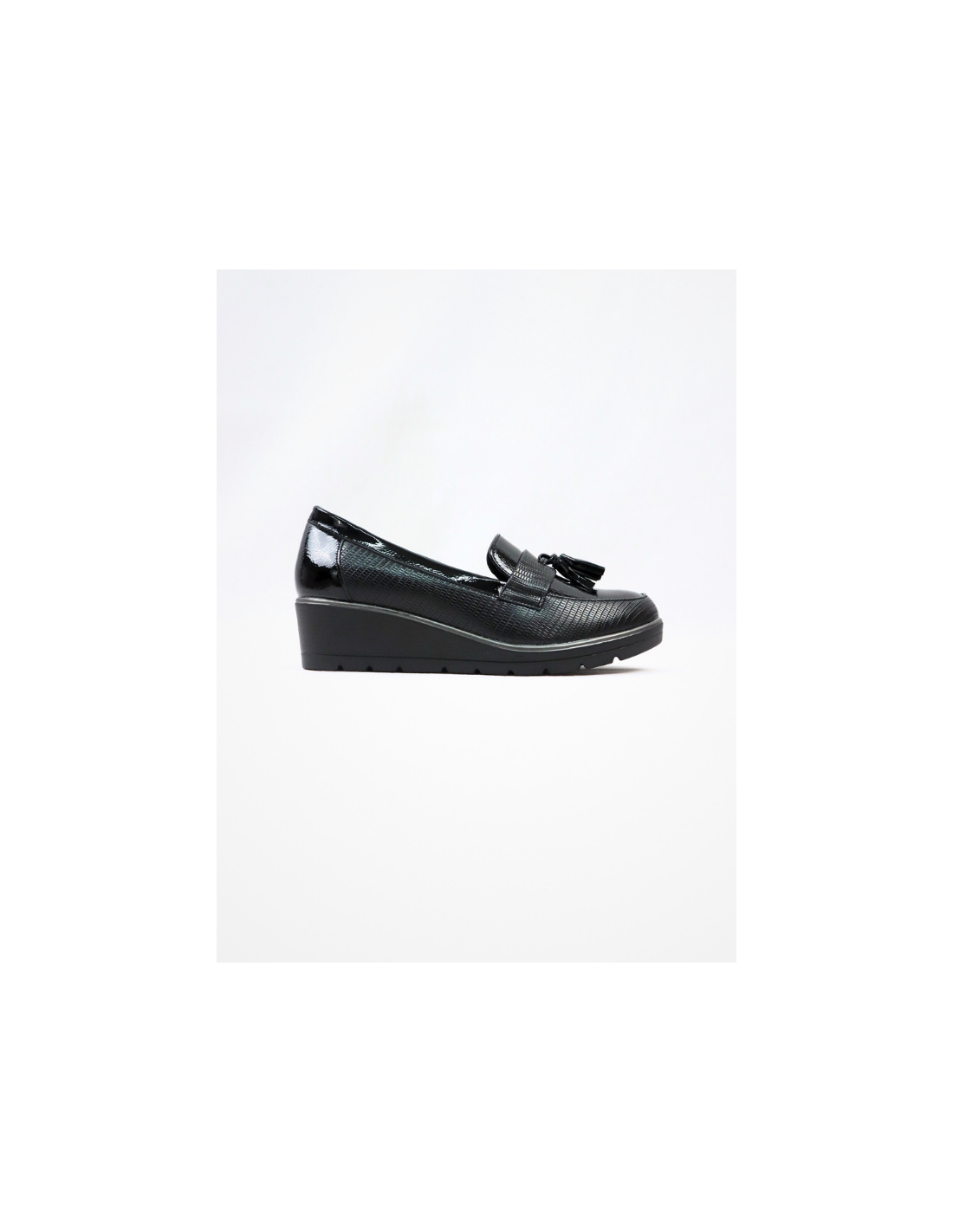 Nueva Colección! Zapato estilo mocasines para mujer, con cuña, color negro, corte charol, efecto cocodrilo, plantilla lisa, piso goma, punta cerrada, suela dentada para mejor comodidad y seguridad, diseño casual formal, temporada otoño/invierno,