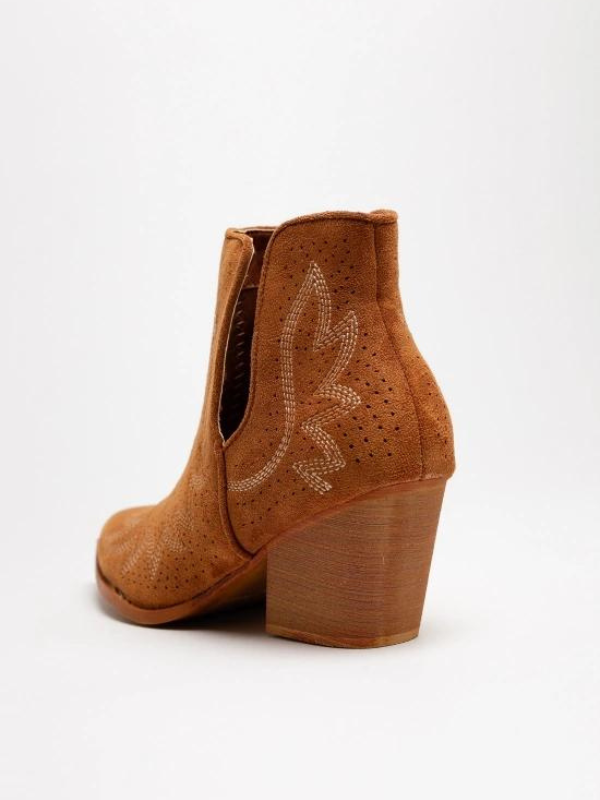 Botín cowboy, en antelina, diseño con aberturas laterales, decorado con costuras.