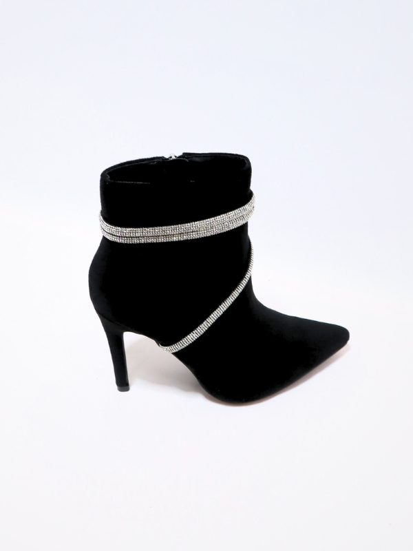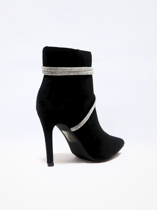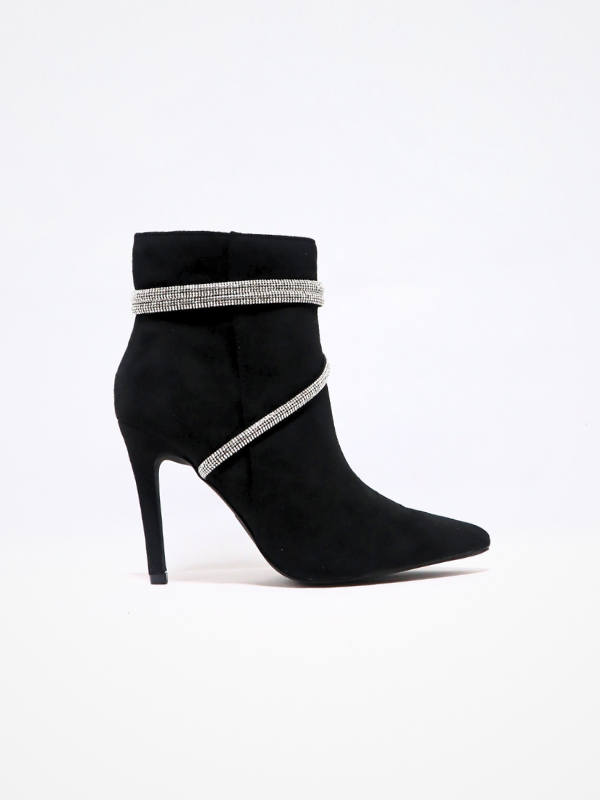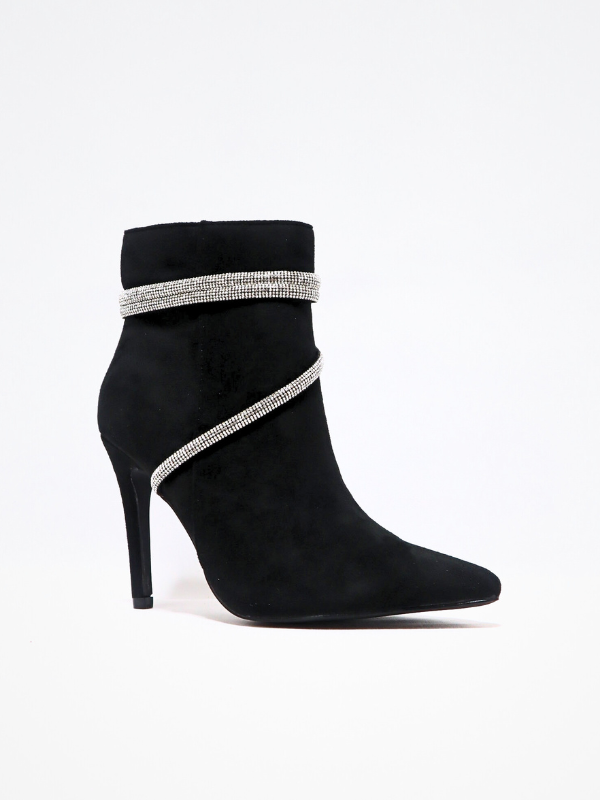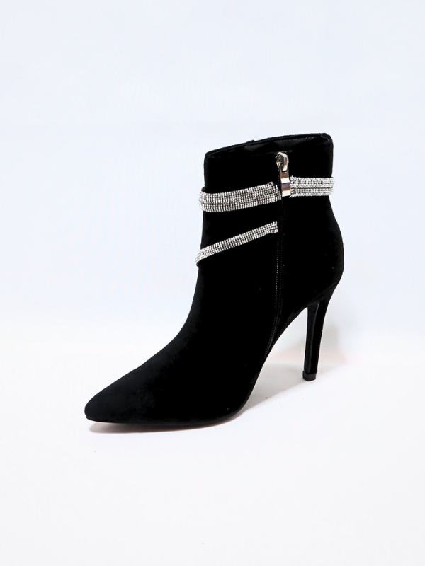 Nueva Colección! Botín elaborado en ante, con tacón alto, para mujer, cierre de cremallera por el lateral del botin, con detalle decorativo de cuerda con brillos por el contorno del botín, color negro, elaborado en ante, corte liso, piso goma, punta cerrada, suela de goma antideslizante, para mejor comodidad y seguridad,  diseño casual elegante y formal, ideal para completar el look para la fiesta,  facil de combinar, temporada Primavera/otoño/invierno.