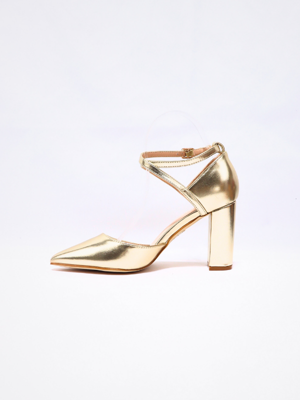 Nueva Colección! Zapato con tacón ancho, acabado en punta, con una tira cruzada tobillera ajustable de sujeción lo que le da una mejor seguridad y paso mas estable al andar, de plantilla lisa, modelo de moda casual elegante, ideal para complementar looks de fiesta,  facil de combinar, cómodas. temporada primavera, otoño, diseño elegante. estilo en tendencia! color dorado.
