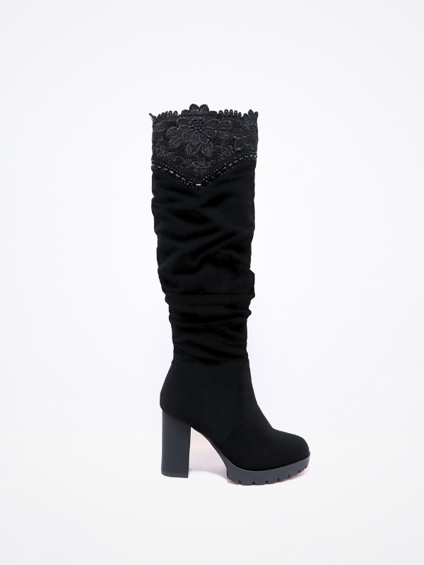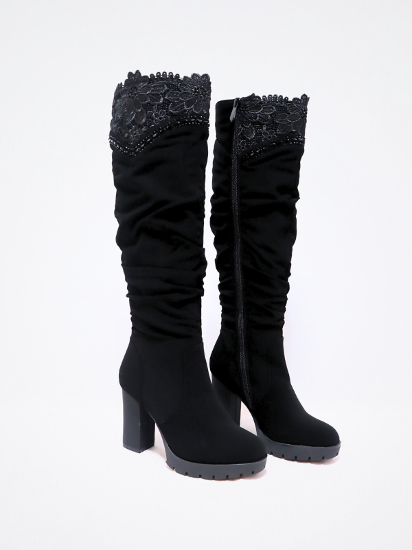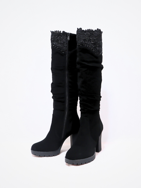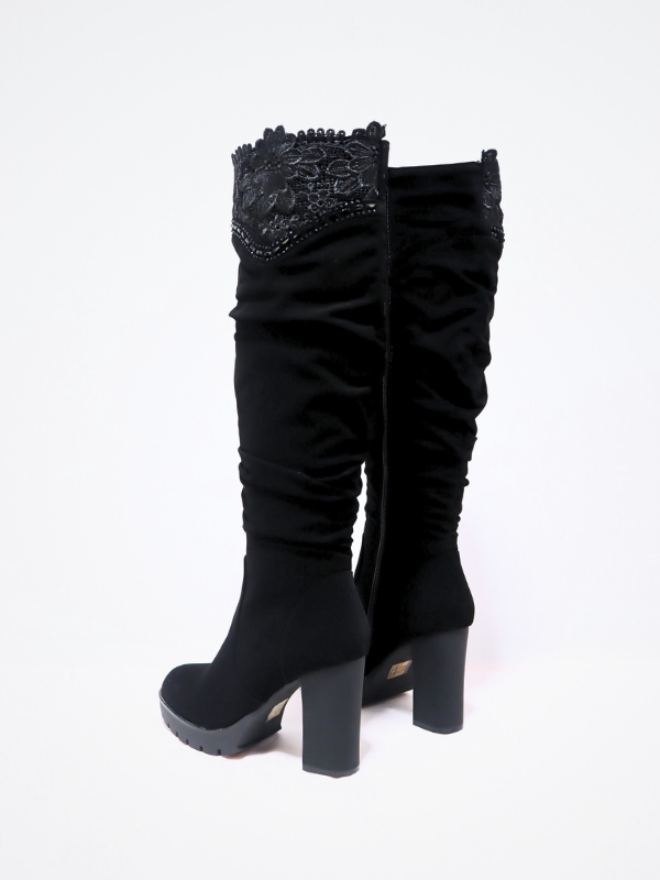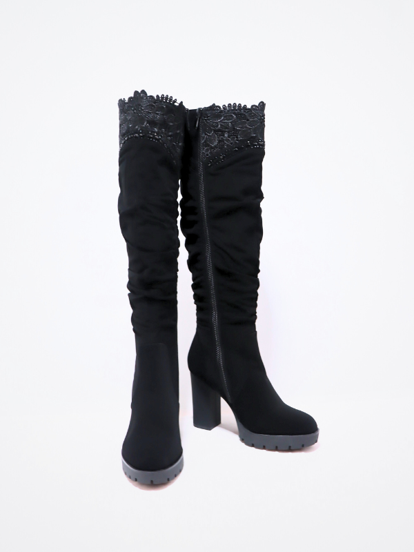 Nueva colección! bota alta de ante textura de tercipelo con detalle de encaje bordados en la parte superior, tacón grueso y plataforma. estilo de moda en tendencia!