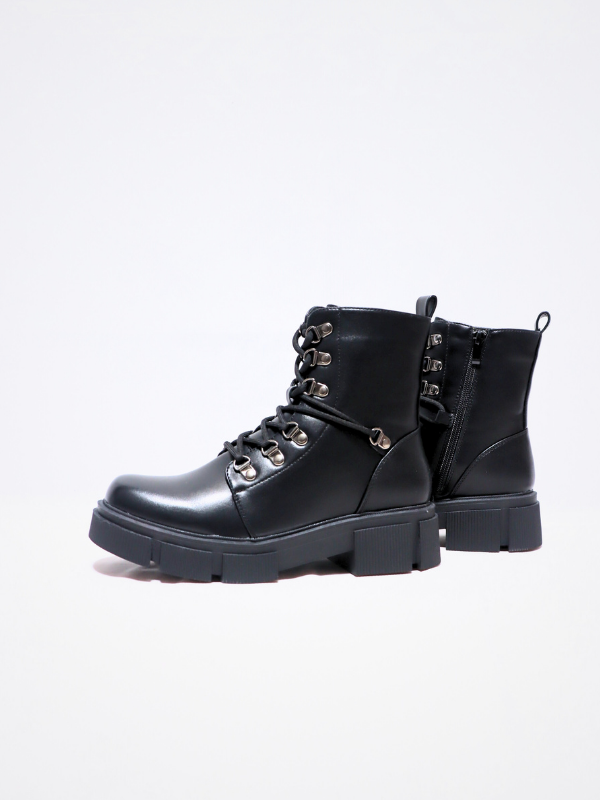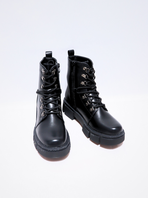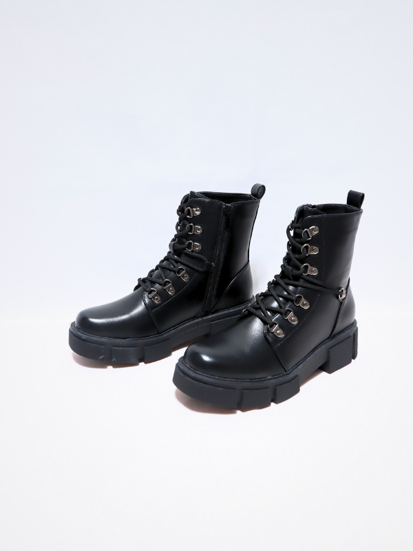 Nueva Colección! Botín juvenil estilo militar, con cordones, cuerda trasera de sujeción que facilita la puesta, cierre mediante cremallera, de suela trac antideslizante y lo que le da estabilidad y seguridad al andar, botín unicolor liso negro, estilo casual clásico pero muy en tendencia ideales para personas que buscan comodidad, ideales para completar looks, para día a día, combinables y cómodos! para Temporada, primavera/ Otoño/invierno.