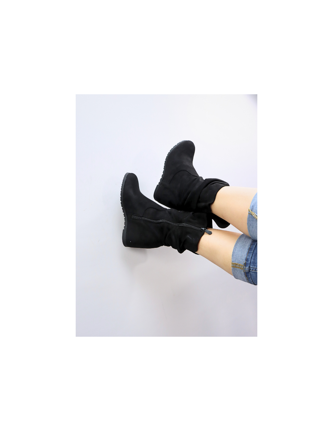 Wedge boot, black color, with gathered shaft, made of suede, side zipper closure, rubber sole.