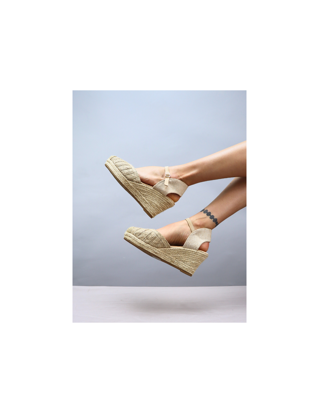 Low wedge espadrille made of esparto grass, open heel, adjustable ankle strap support, ideal for spring-summer.