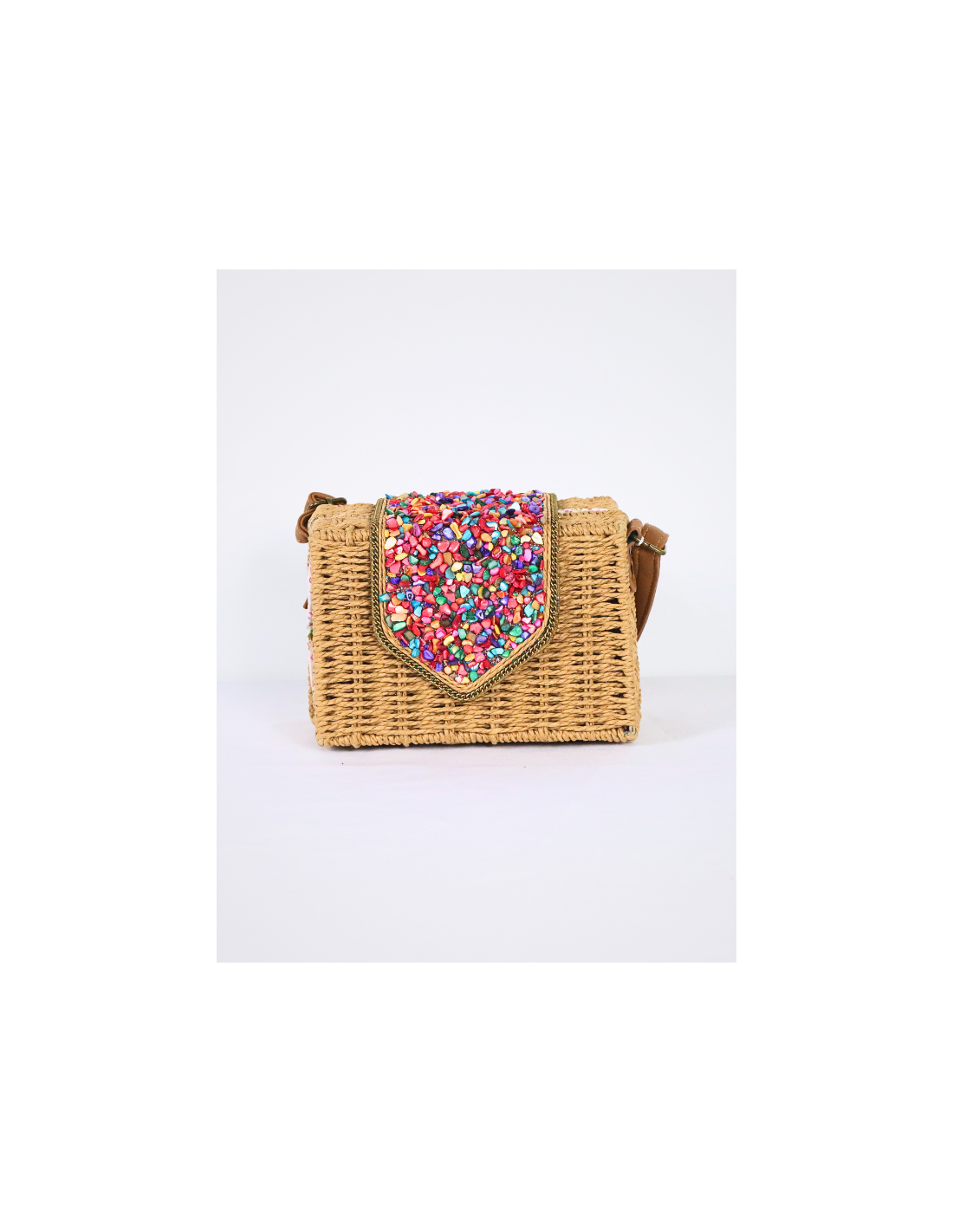 Small square bag, with adjustable shoulder strap, bag made of raffia, lid design decorated with colored beads, snap button closure, bohemian style! ideal to combine with our esparto sandals collection!