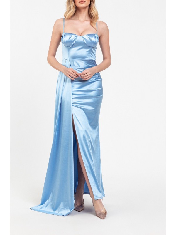 Long party dress, made of satin, with adjustable thin straps, corset-like front part, with cups on the chest, zipper on the back, draped, leg opening, cape design on the skirt, ideal long dress for parties and events. composition 95% polyester 5% elastane. one size.