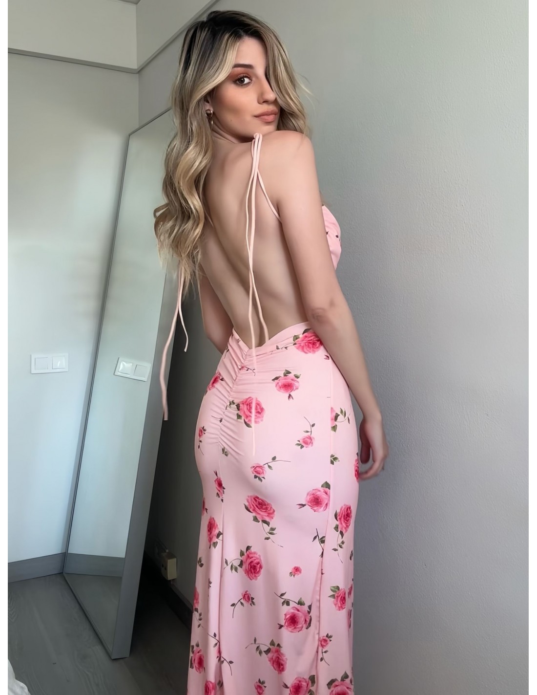 Rose floral print dress, tight midi cut dress, made of 30% viscose 65% polyester 5% elastane, with thin straps, soft and fresh touch, dress with gathered details that highlight the figure on the sides and back , open back dress, easy to combine with shoes and bags, ideal for the spring summer season.