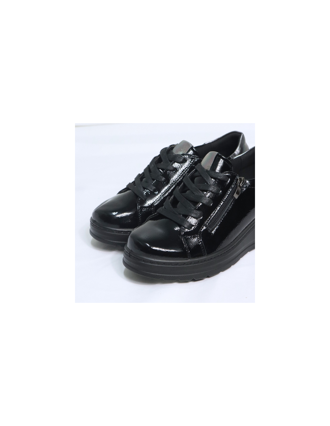 Zapatillas negras de charol con suela gruesa ligera, cordones y cremallera
