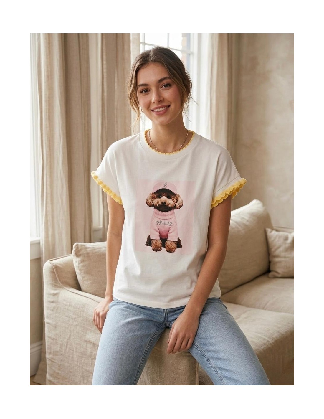 Camiseta Estampada con Volantes en Manga y Cuello Diseño Oversized de Cachorro Estilo Parisino