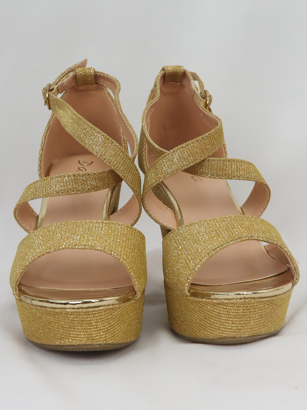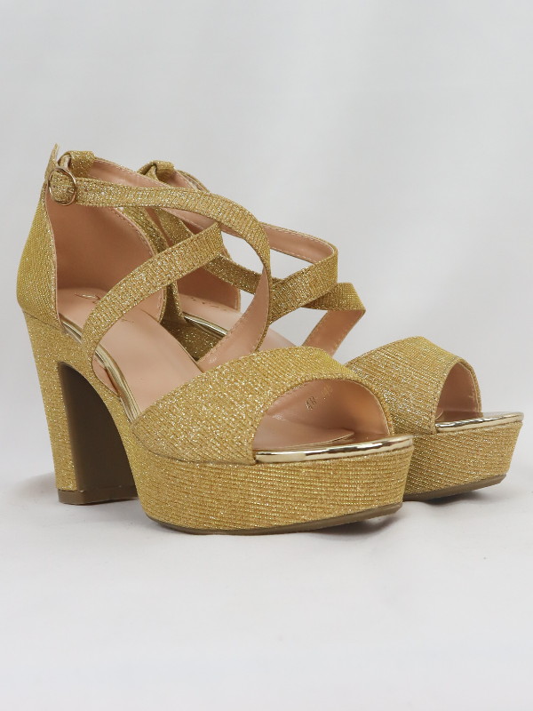Sandalia de tacón grueso, y plataforma, color dorado, plateado, brillo chispeante, con detalles de cuerdas cruzadas con brillo, tira tobillera ajustable y cierre de hebilla, punta abierta, talón cerrado, plantilla lisa, suela antideslizante, modelo de moda casual- elegante, ideal para fiestas, facil de llevar y combinar, cómodas.