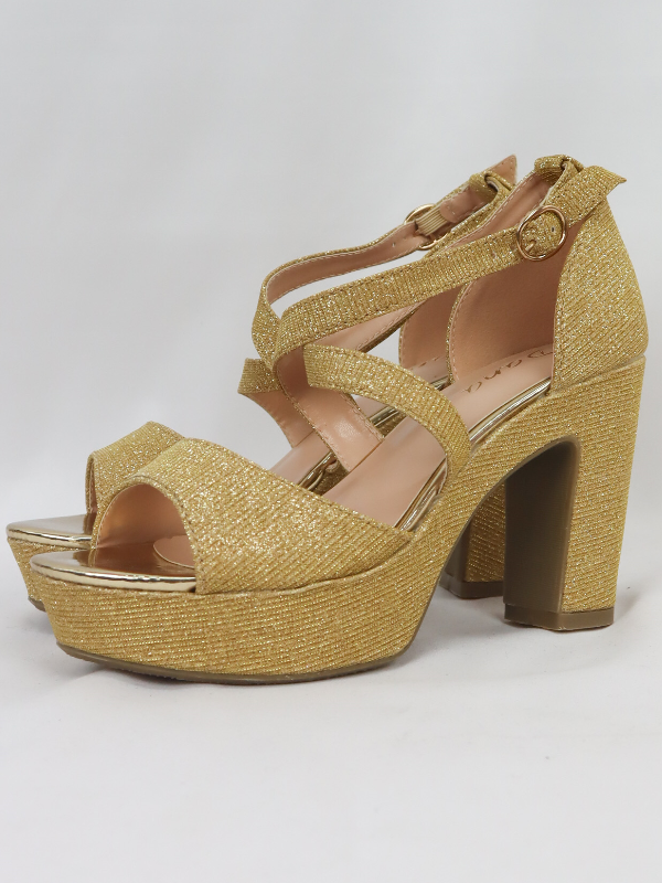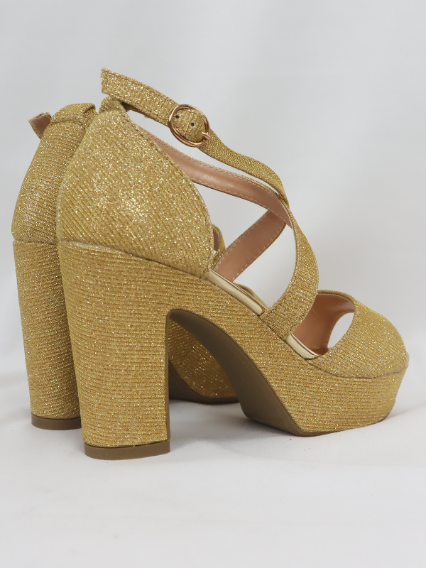 Sandalias de tacón grueso, y tira tobillera, brillo chispeante. colores: plateado y dorado.