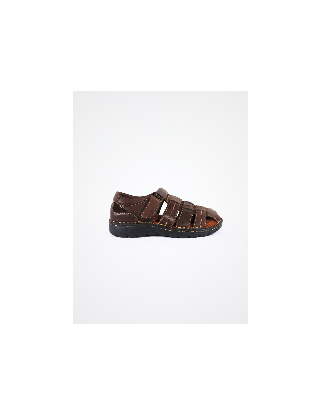 Sandalias de piel autentica para hombre, diseño de bandas, puntadas, puntera semi cerrada, cierre de velcro, plantilla suave, suela de caucho resistente.
