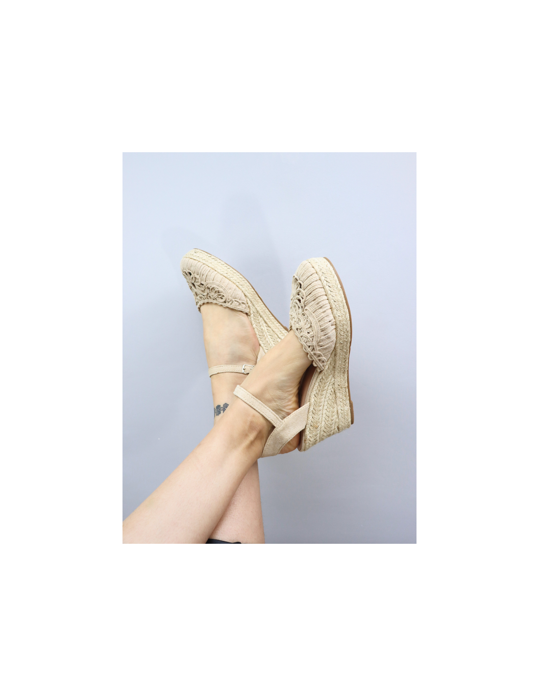 Alpargatas cuña crochet, color beige, cierre de hebilla, diseño en crochet.