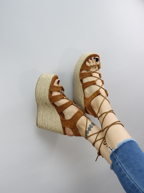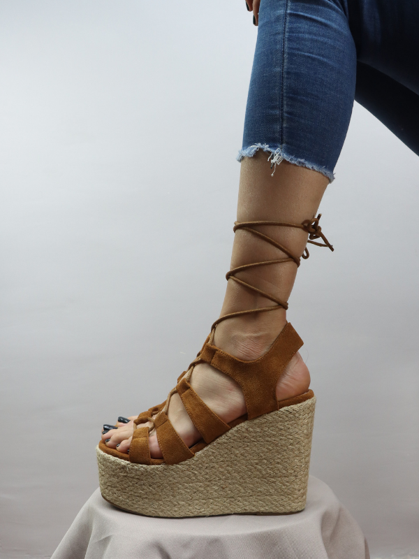 Sandalias de diseño de cuerdas con Punta redonda y plataforma, destalonadas, con cuña en bonito color camel.
