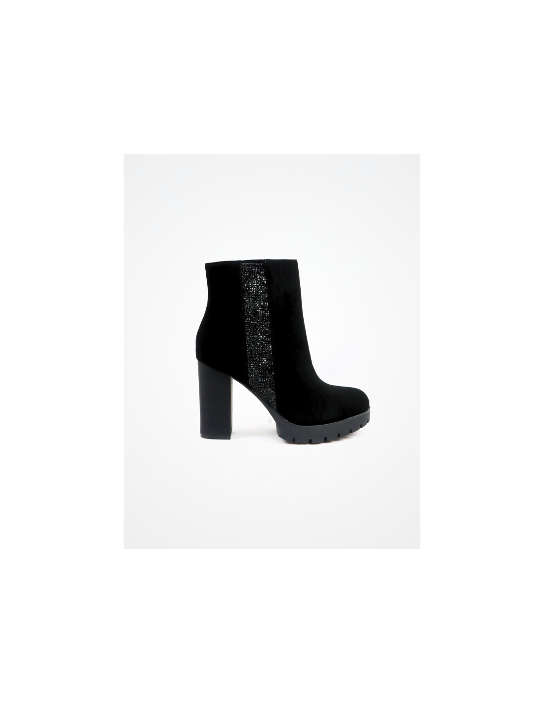 Nueva Colección! Botín de tacón alto 9,6 cm y doble plataforma de 2 cm, que hace que el botín sea mas estable al andar, elaborado en antelina, cierre de cremallera lateral, acabada en punta redonda, color negro liso, con suela de goma antideslizante, detalle franja con brillos decorativo, diseño clásico pero actual!, cómodos para andar y  muy combinable con cualquier estilo, con vestidos, faldas, pantalones, ideal para día a día y trabajar,  Temporada Primavera, otoño, invierno.  Estilo en tendencia.