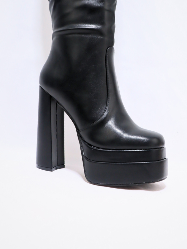 Nueva Colección! Bota alta, con tacón y doble plataforma que le da estabilidad y seguridad al andar, botas unicolor liso negro, con cierre de cremallera por el lateral interior de la bota, estilo muy moderno y en tendencia! ideales para fiestas y reuniones, combinables con vestidos y faldas, ideales para hacer fotos! para Temporada, primavera/ Otoño/invierno.
