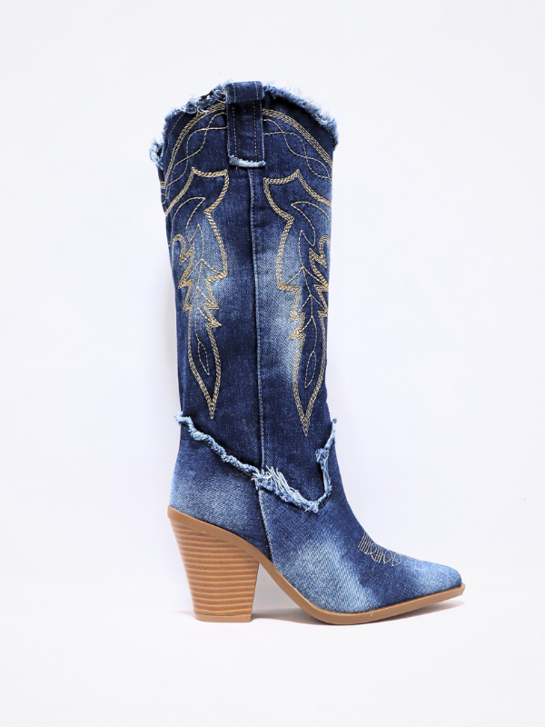 Nueva Colección! Bota estilo cowboy, con diseño de bordado en la caña, color azul vaquero oscuro, cierre de cremallera lateral, acabada en punta, con un tacón grueso de 8,5 cm que hace la bota estable al andar, diseño de moda en tendencia!, cómodas para andar y muy combinable con cualquier estilo, con vestidos, faldas, pantalones, Temporada Primavera, verano, otoño, invierno. Estilo en tendencia.