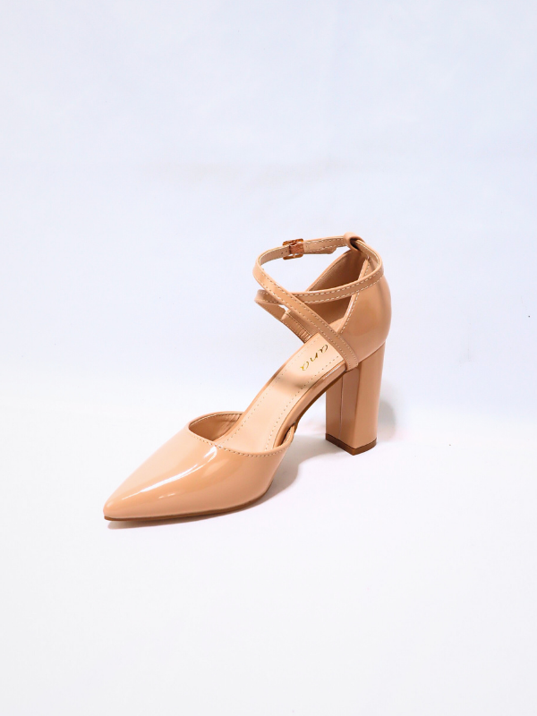 zapatos de tacón ancho, acabados en punta, con tira tobillera cruzada, color nude, estilo en tendencia!