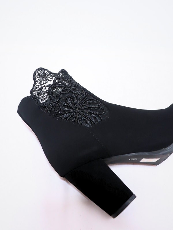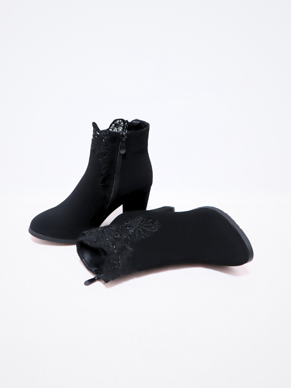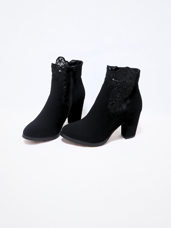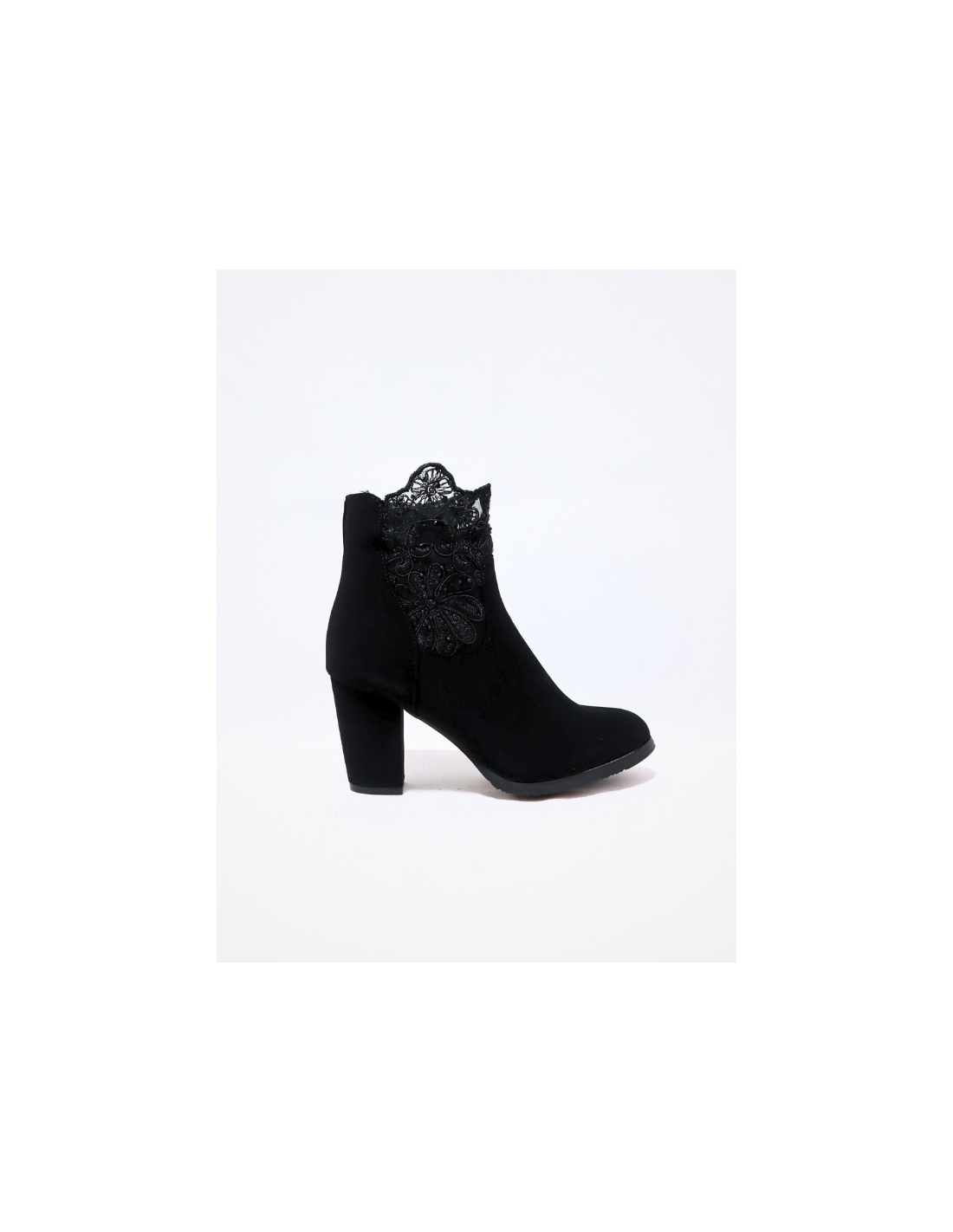 Nueva Colección! Botín elaborado en ante, detalle de encaje bordados por la parte superior lateral del botín, con tacón grueso, para mujer, cierre de cremallera por el lateral del botín, con detalle decorativo de encaje, color negro, elaborado en ante, corte liso, piso goma, punta cerrada, suela de goma antideslizante, para mejor comodidad y seguridad,  diseño casual elegante y formal, ideal para completar el look para la fiesta,  facil de combinar, temporada Primavera/otoño/invierno.
