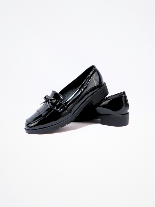 Nueva Colección! Zapato estilo mocasines para mujer, con cuña, acabado en punta redonda, sin cordones, facil de poner, color negro, corte efecto charol, detalle de flecos y lazo por el empeine del zapato, plantilla lisa, piso goma, punta cerrada, suela antideslizante para mejor comodidad y seguridad, diseño casual de vestir, ideal para completar looks formales para trabajar, o diario, y combinar con ropa para vestir, temporada otoño/invierno,