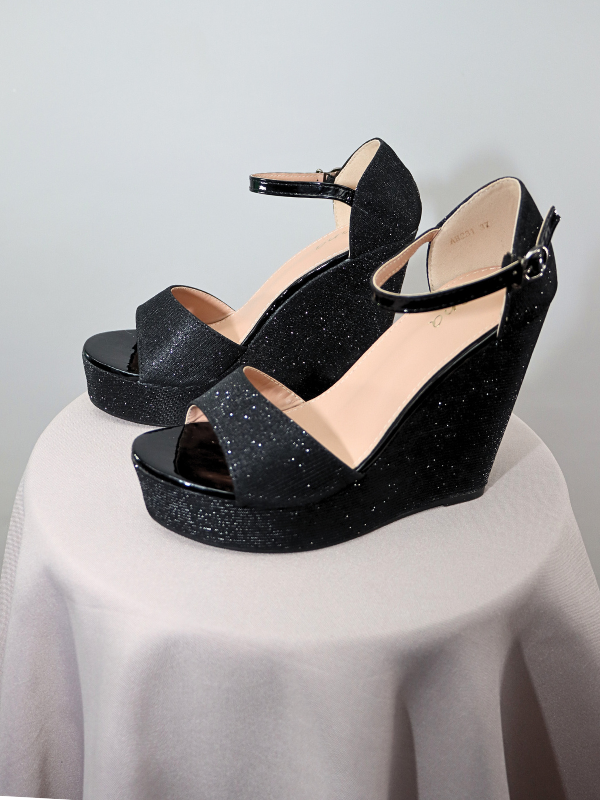 Nueva Colección! Sandalias de cuña, color negro con brillo chispeante, talón cerrado, cierre de hebilla tira tobillera ajustable, plantilla lisa, suela de goma antideslizante, ideal para complementar looks de fiesta, facil de combinar con todo tipo de estilos, vestidos, pantalones cortos y largos, faldas, combínalas con nuestra colección de camisetas de fiesta, ideal para la temporada Primavera/otoño/invierno. estilo y colores en tendencia, altura de cuña: 3.5 cm Altura de cuña: 13 cm