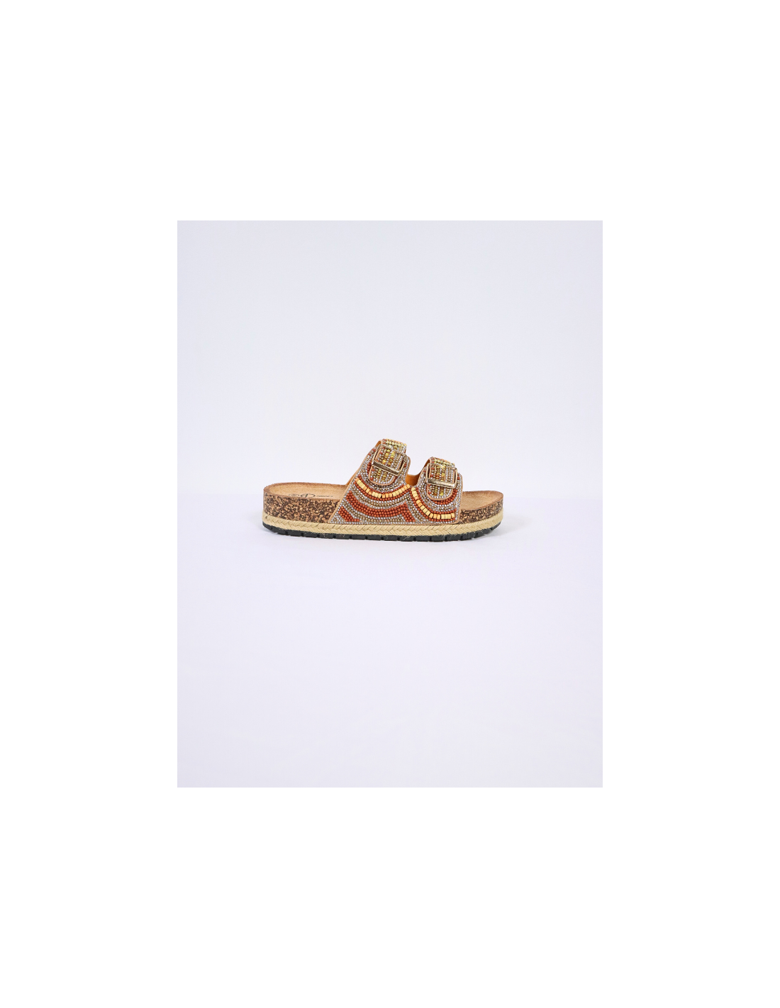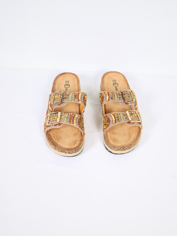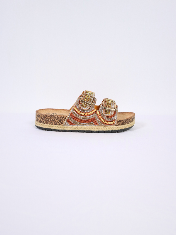 Sandalia plana de verano, suela de goma bio, detalle de esparto trenzado por el borde, plantilla suave, con diseño de doble hebilla y detalles decorativos de abalorios multicolor estilo tribal, punta abierta, destalonadas, suela antideslizante, sandalia de moda casual, ideal para temporada primavera / verano, o llevar de diario facil de combinar, cómodas.