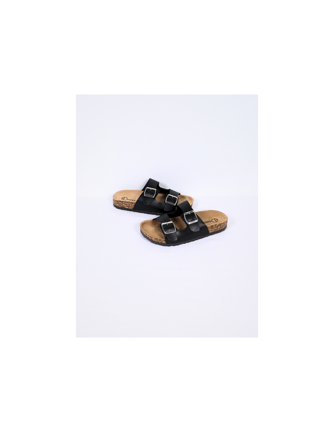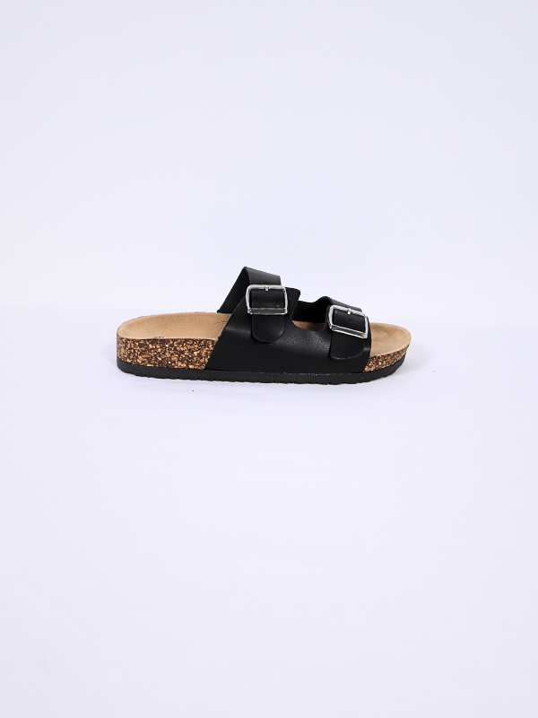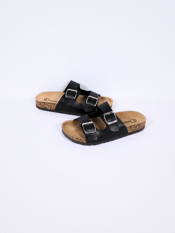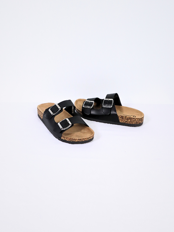 Sandalia de verano plana, suela de goma, plantilla suave, con diseño de doble hebilla en material polipiel, punta abierta, destalonadas, suela antideslizante, sandalia de moda casual, ideal para temporada primavera / verano, o llevar de diario facil de combinar, cómodas.