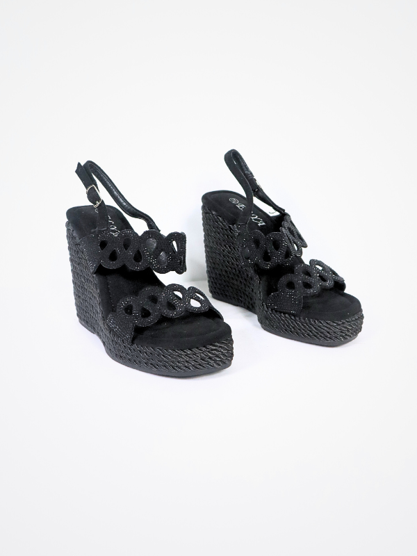 Sandalia de cuña alta, color negro, suela de goma, con detalles de cuerdas en formas geometricas circulares y destellos de brillo, plantilla suave, tira tobillera ajustable y cierre de hebilla, punta abierta, talón cerrado, modelo de moda casual, ideal para temporada primavera / verano, o llevar de diario facil de combinar, cómodas.