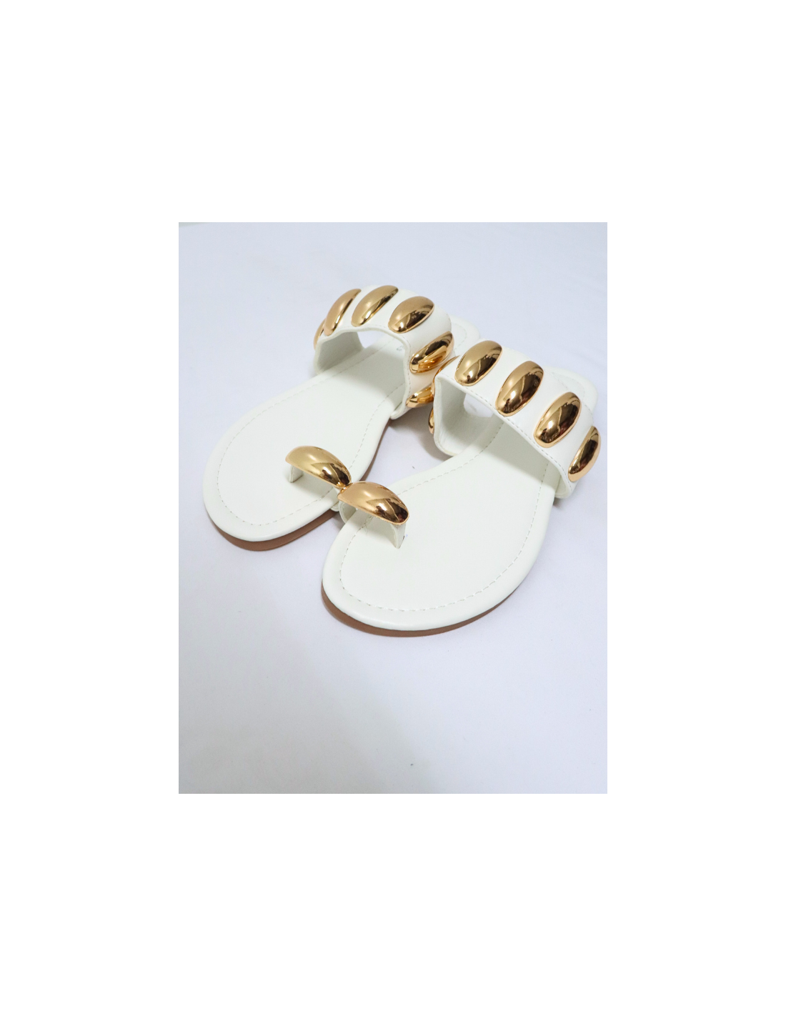 Puedes añadir accesorios dorados o metálicos para complementar el detalle del adorno en la sandalia.