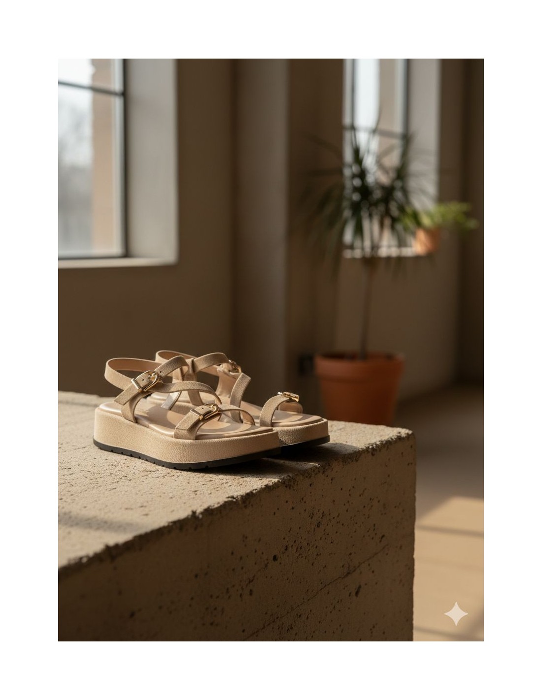 Sandalias planas para mujer en color marrón, diseñadas con múltiples correas ajustables y elegantes hebillas metálicas doradas. Fabricadas con material de textura suave y plantilla acolchada para mayor comodidad durante todo el día. Su suela gruesa y ligera proporciona estabilidad y soporte, combinando estilo moderno con practicidad. Un diseño versátil que aporta un toque sofisticado a cualquier look casual.
