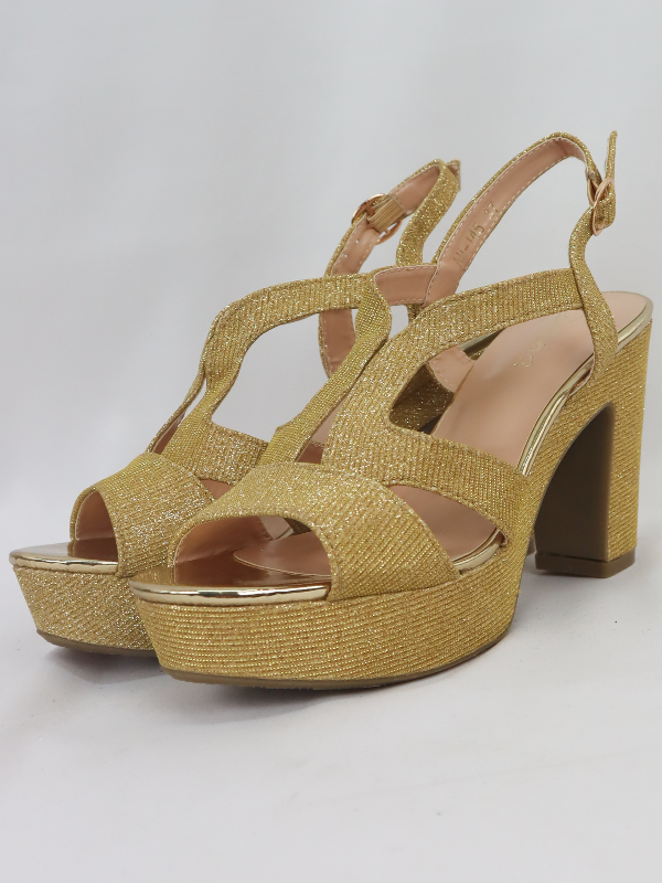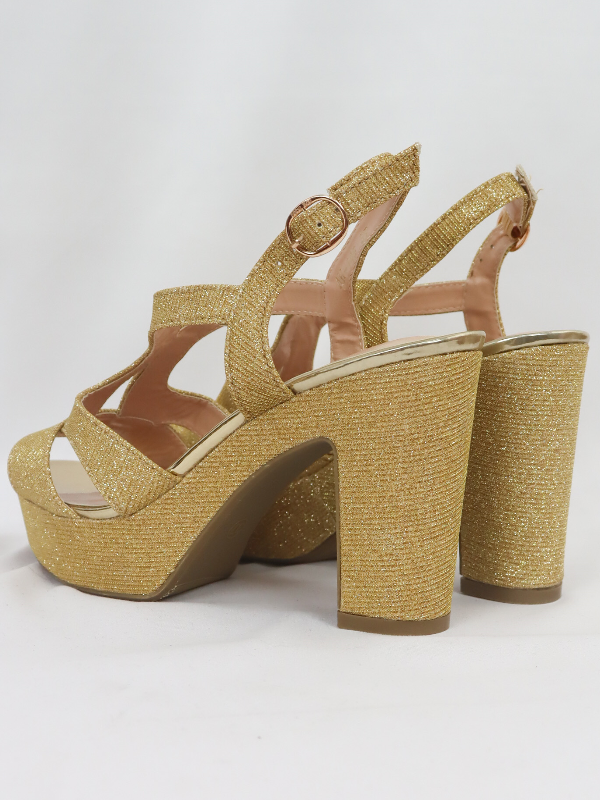 Sandalia de tacón grueso, y plataforma, color dorado, plateado y negro brillo chispeante, con detalles de cuerdas con brillo, tira tobillera ajustable y cierre de hebilla, punta abierta, talón cerrado, plantilla lisa, suela antideslizante, modelo de moda casual- elegante, ideal para fiestas, facil de llevar y combinar, cómodas.